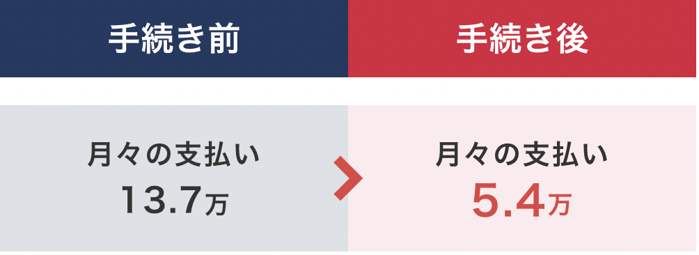 交渉の末、月々の返済額は合計で約5万円、返済期間は約5年で和解が成立し、相談前に懸念していた、返済の負担がかなり減り、夫にもバレずに返済をしていけそうなので、対応して頂いた事務所の方にはとても感謝しています。(43歳/女性)